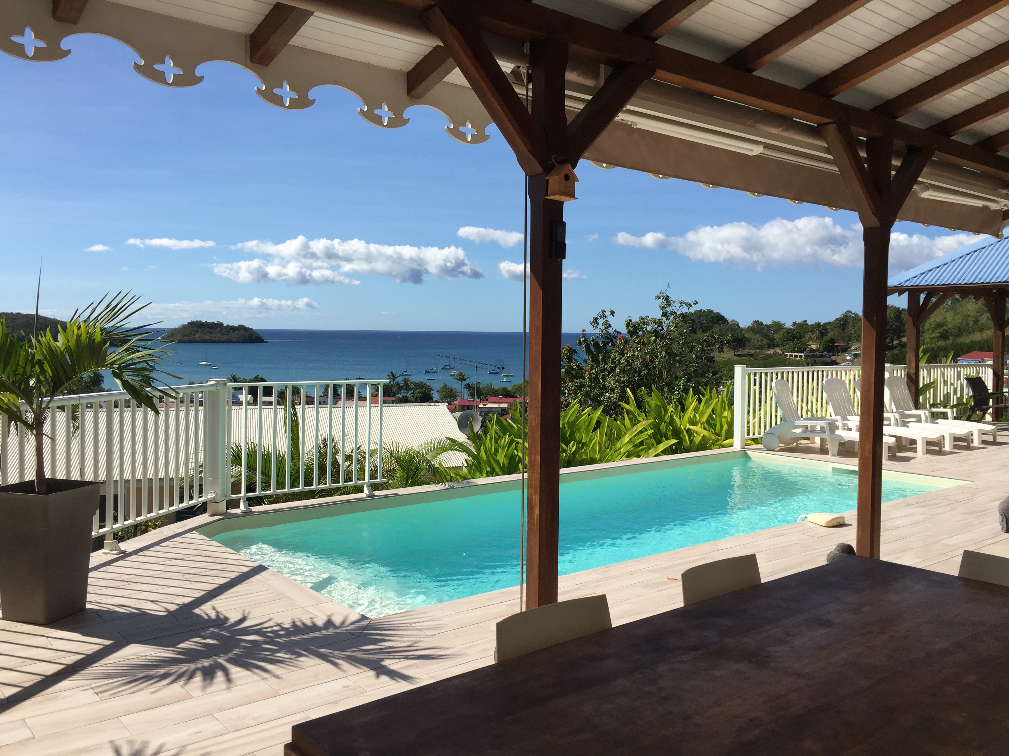Une belle terrasse carrelée dotée d’un grand salon pour la détente, d’un espace repas ; l’ensemble donnant sur la piscine et le jardin avec vue sur mer et l’ilet Ramiers. Un carbet équipé d’un salon et de transats invitant au farniente.